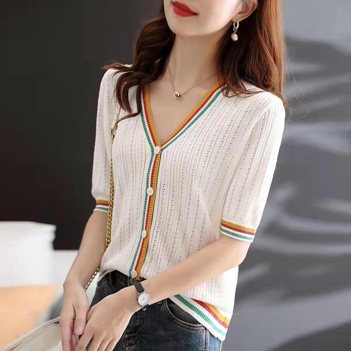 送料無料 カーディガン女性セーターボタンアップトップ夏薄い 2022 半袖ニットトップス V ネックストライプセーター ショート ハーフスリーブ サマー 夏物 Vネック AE1212887727524679711 | 女性の為の通販サイト-fashion navi