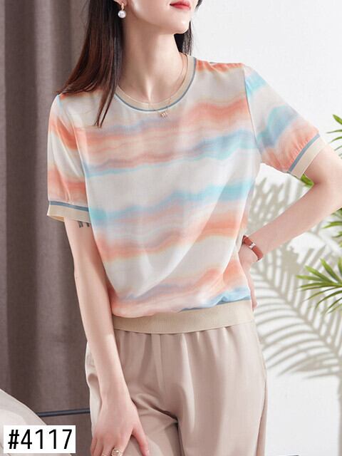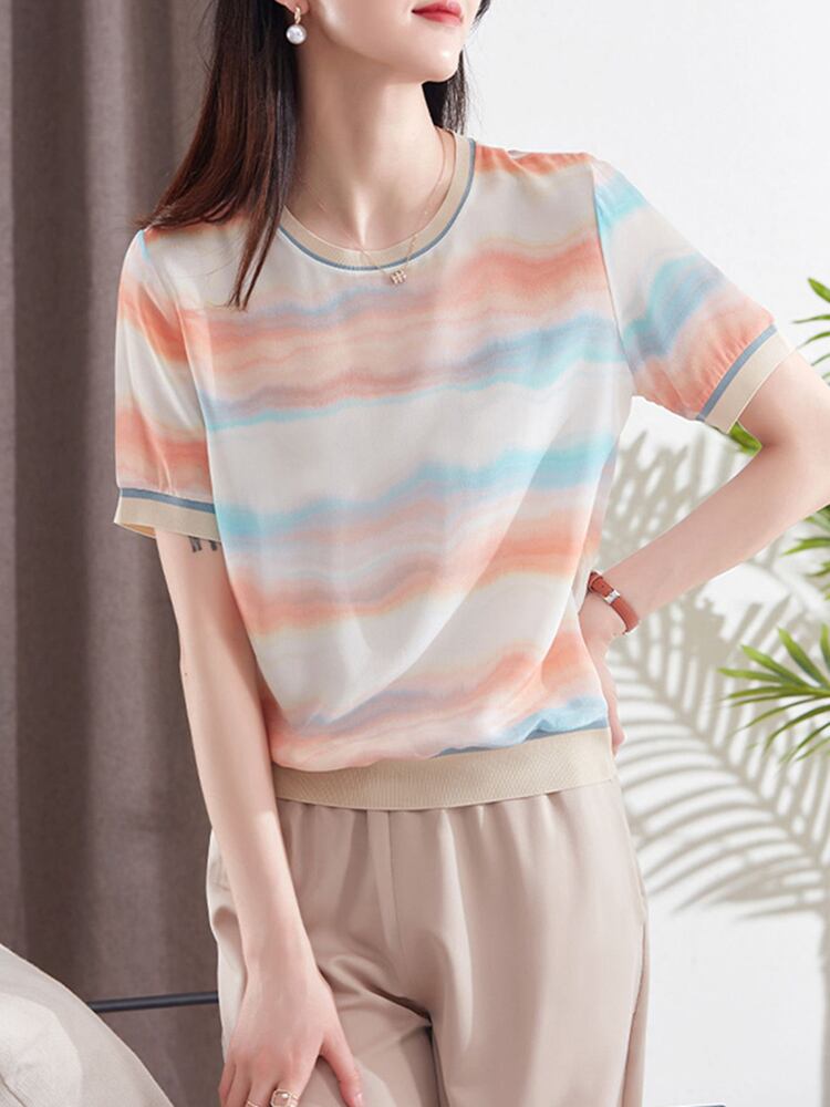 送料無料 De Moda 2022 夏半袖プリントシフォンブラウス女性 O ネックルーズトップスシルクシャツレディース ショート ハーフスリーブ サマー 夏物 Oネック AE1212887789958706106