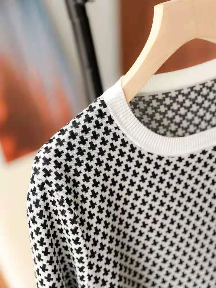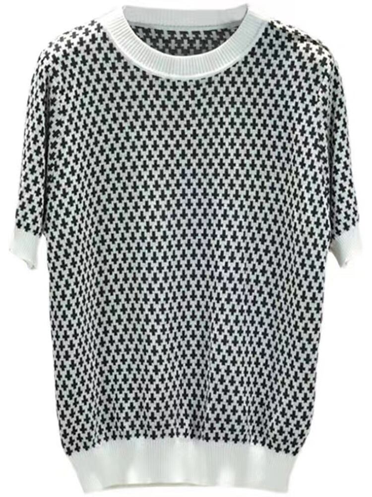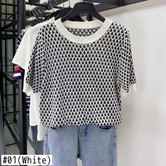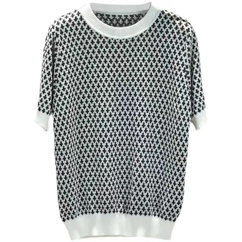 送料無料 薄いチェック柄の基本ニットセーターの女性 2022 夏 O ネック半袖プルオーバートップスレディースプル ショート ハーフスリーブ サマー 夏物 Oネック AE1212887757624381817