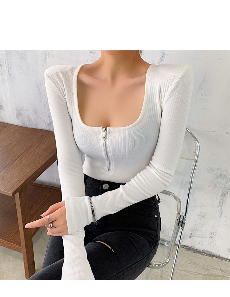 送料無料 白黒ジッパー長袖 Tシャツ女性 2022 秋のセクシーなスリムスクエアカラーコットン Tシャツ Tシャツ ロング ホワイト ブラック オータム 秋物 スクウェア AE1212887712479730718