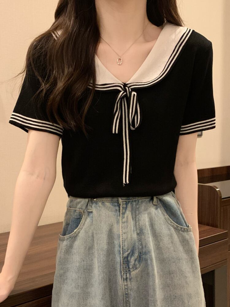 送料無料 プレッピースタイルアイスシルクニットセーター女性セーラー襟半袖トップ 2022 夏薄いプルオーバーストライプセーター女性服 ショート ハーフスリーブ サマー 夏物 AE1212887768909827148