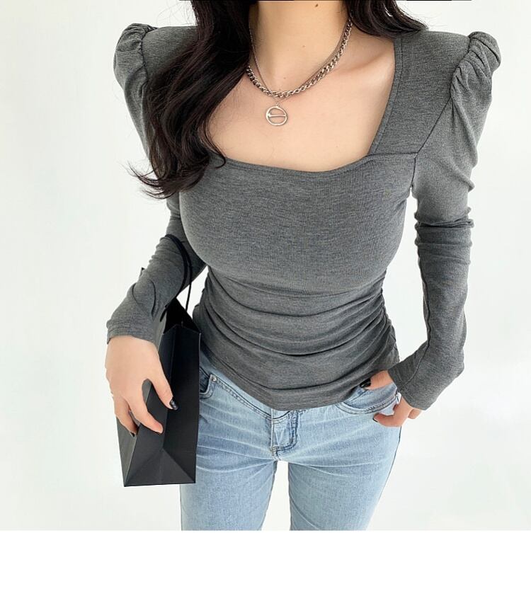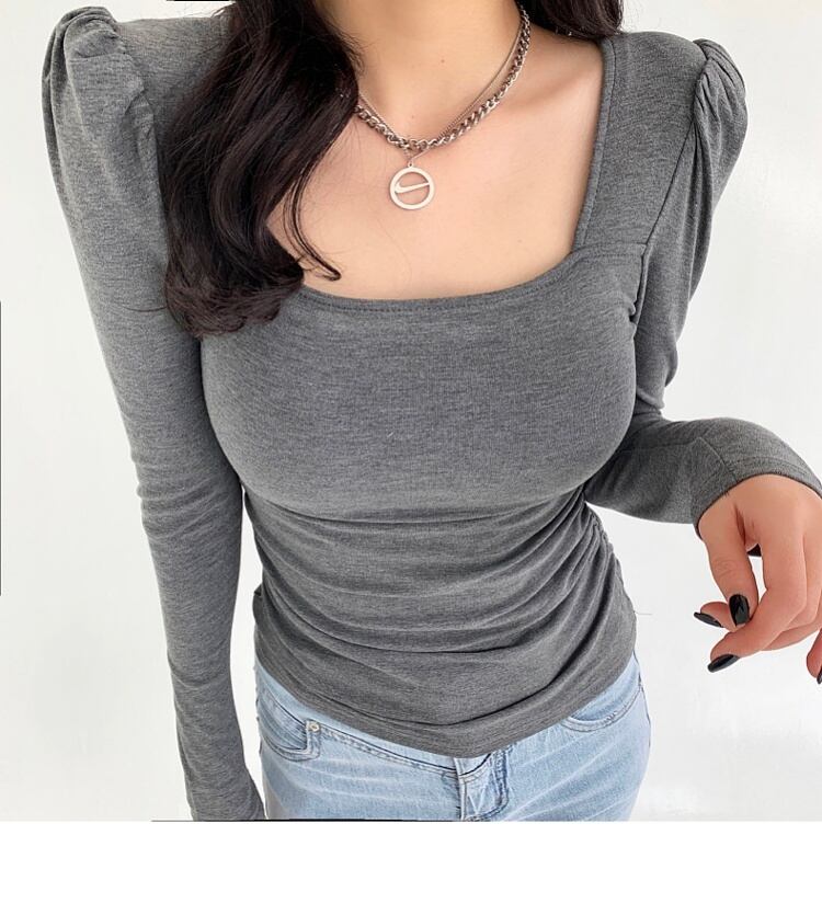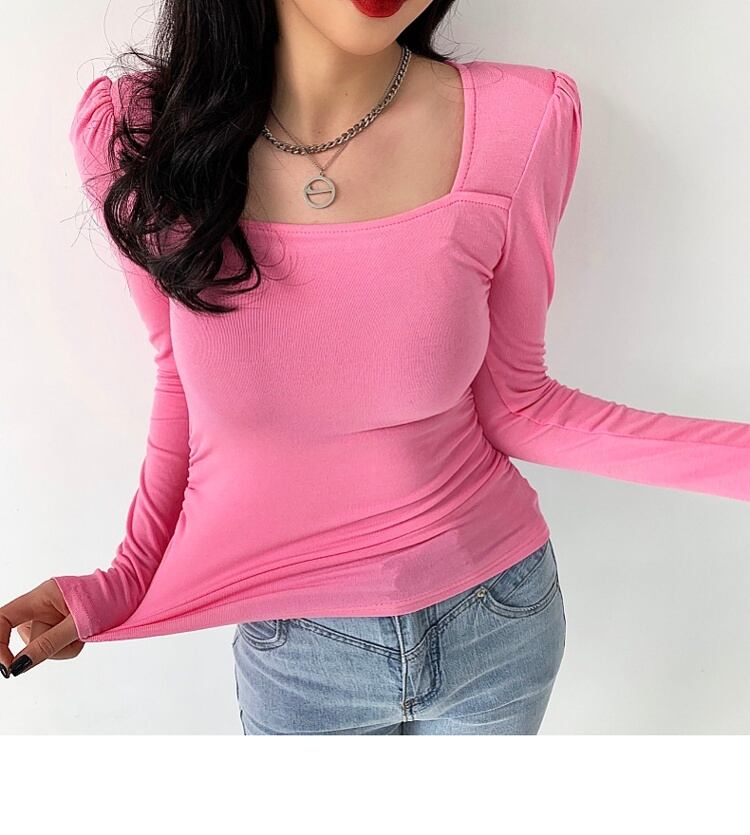 送料無料 トップスセクシーなスリムベーシックスクエアカラー Tシャツ女性パフスリーブコットン Tシャツ春 Tシャツ スプリング 春物 スクウェア AE1212887784534379703