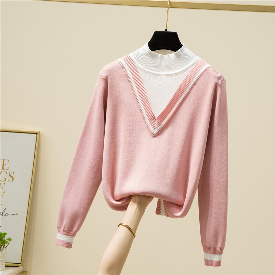 送料無料 女性偽ツーピースセーター黒プルオーバー秋冬服厚いニット半襟長袖トップス ロング ブラック オータム 秋物 ウィンター 冬物 AE1212887760440838758
