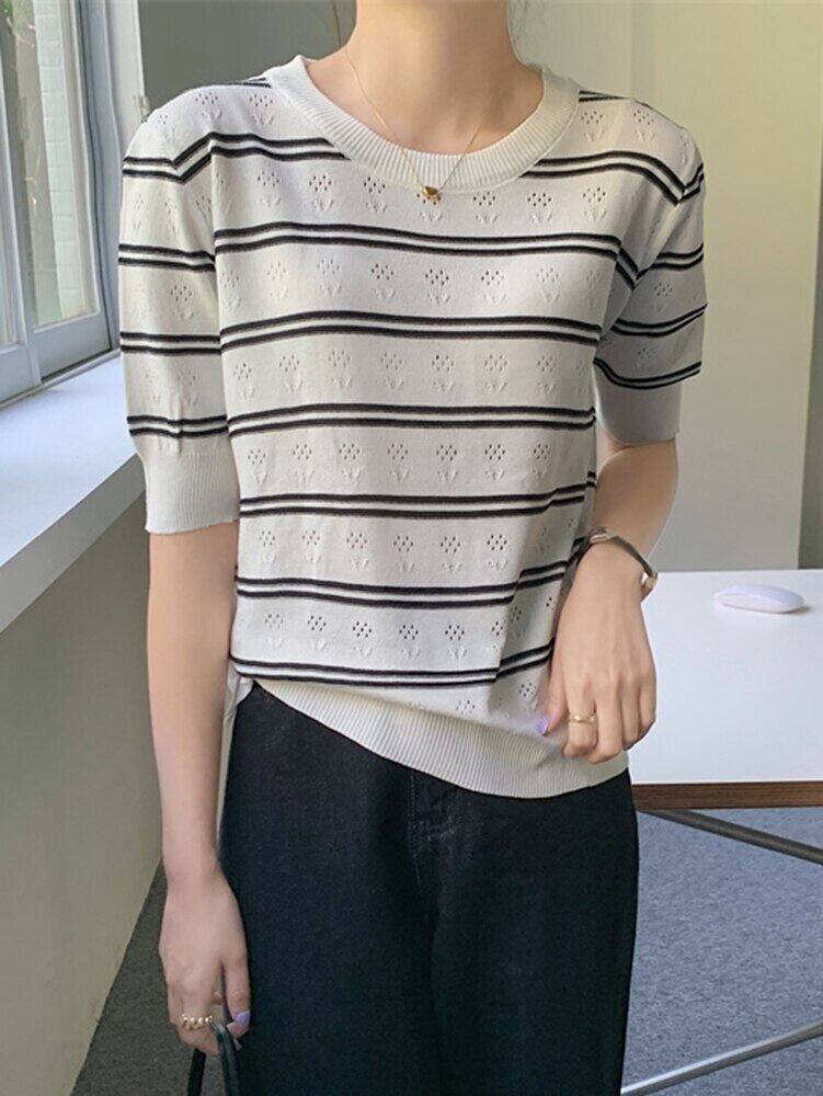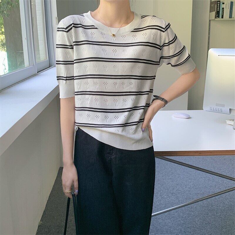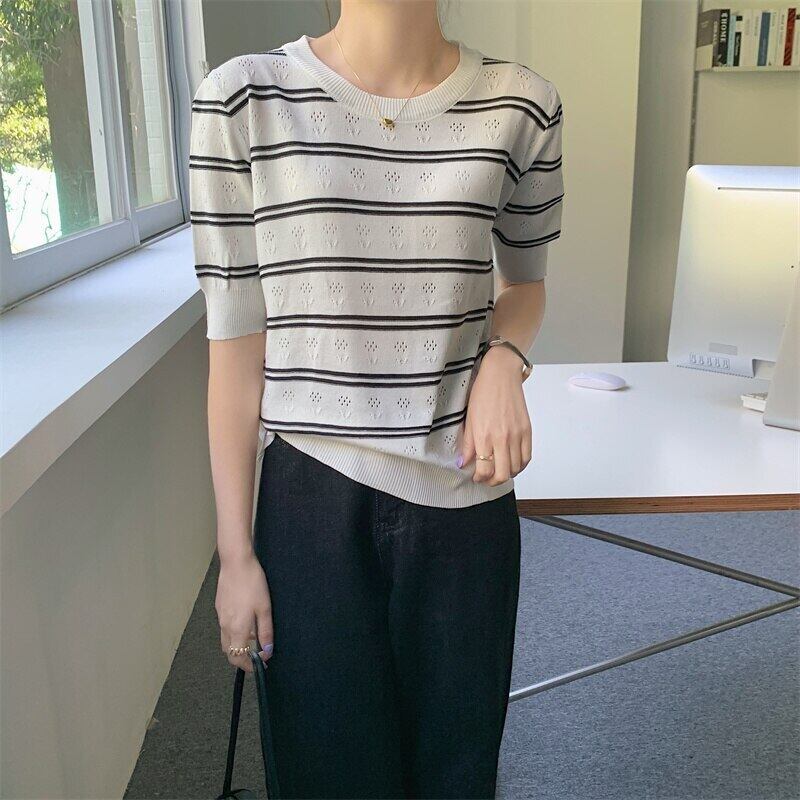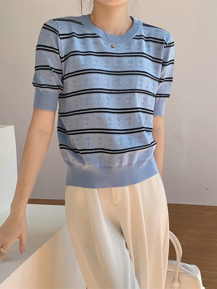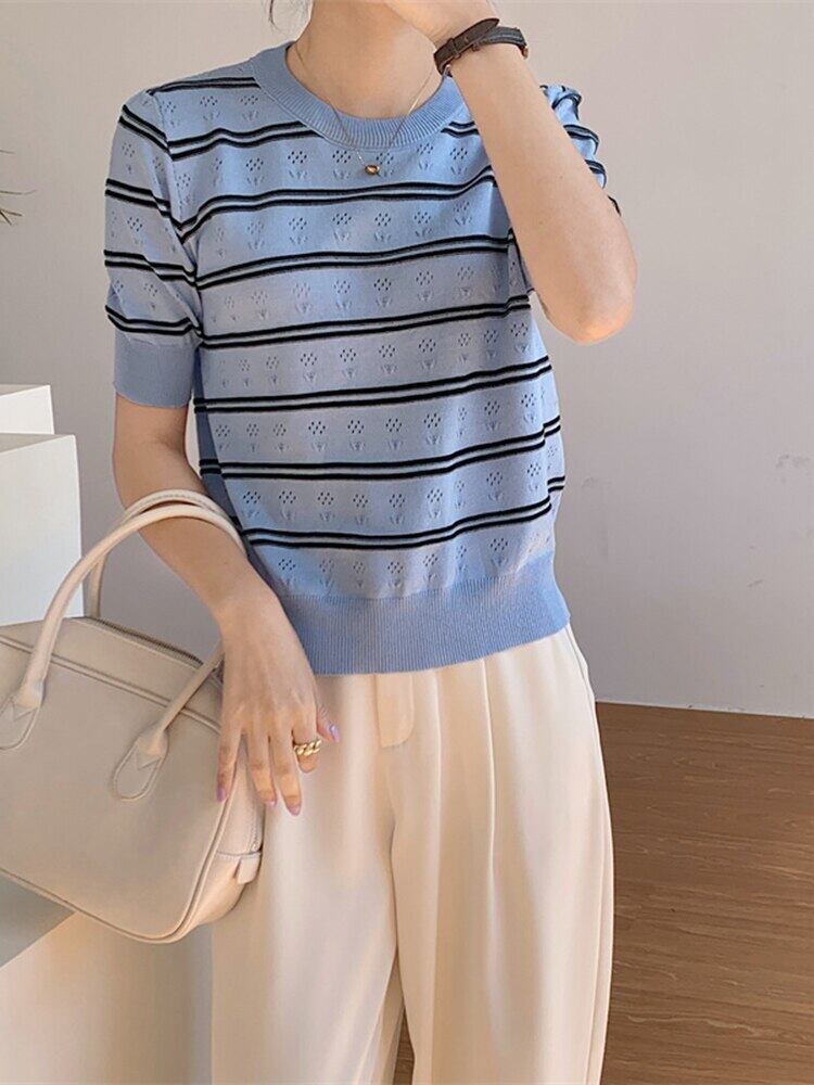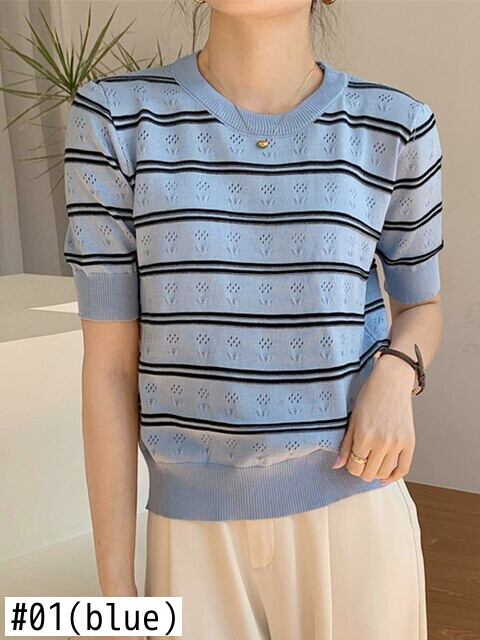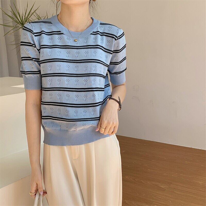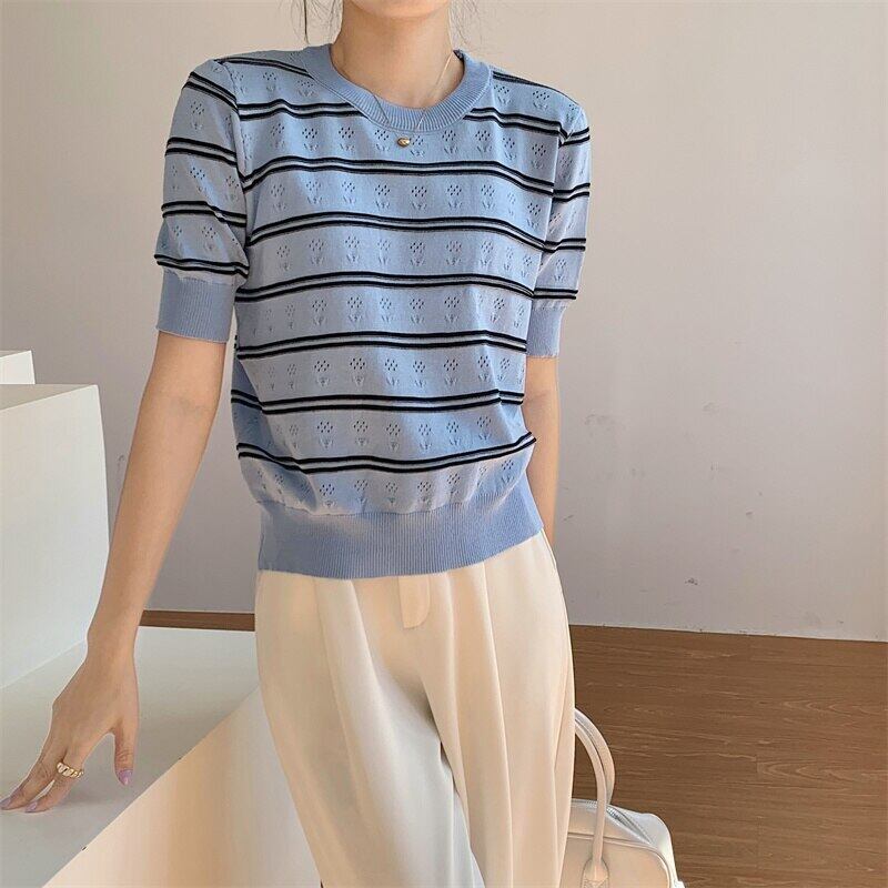 送料無料 ブルーストライプニットセーター女性 2022 夏 O ネック半袖トップルーズプルオーバーセーターレディースセーターデ ショート ハーフスリーブ サマー 夏物 Oネック AE1212887768324151816