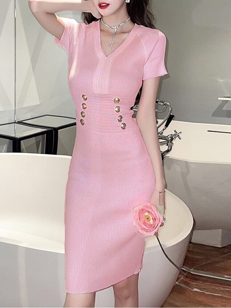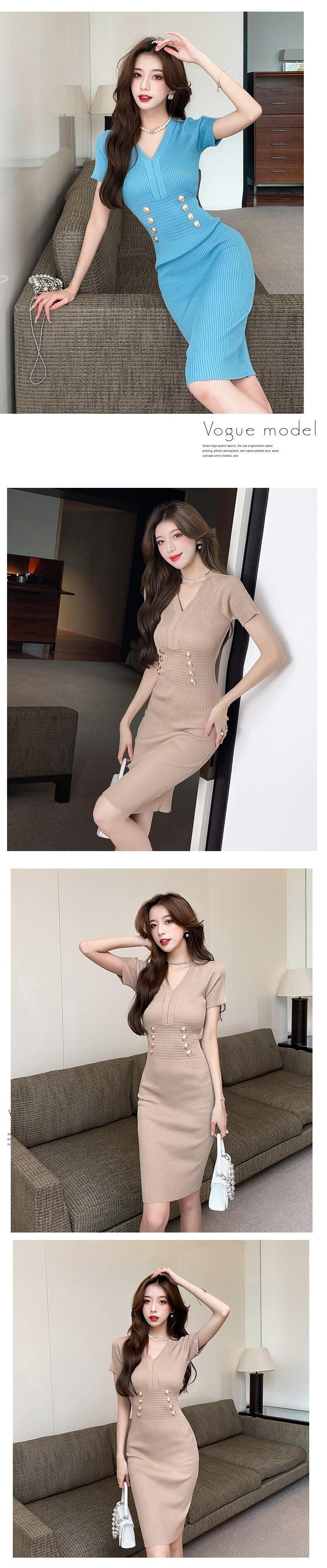 送料無料 セクシーな V ネックドレス女性ボタン半袖薄手ニットスカート 2022 夏黒スリム女性ドレス ショート ブラック ハーフスリーブ サマー 夏物 Vネック AE1212887794696867527
