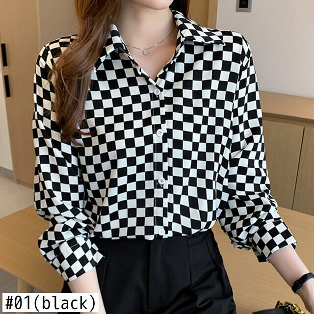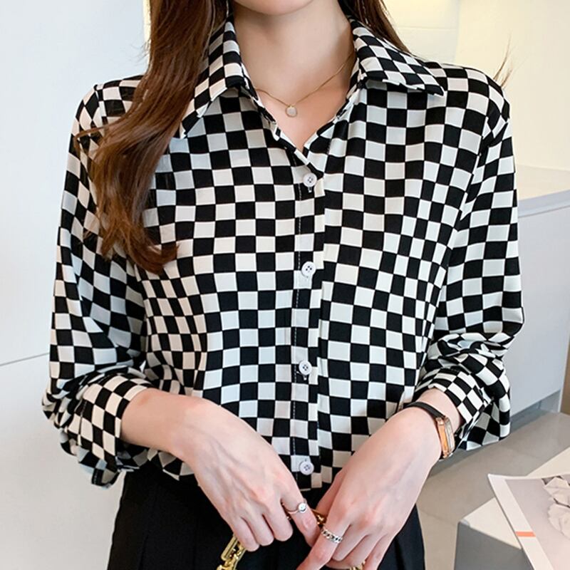送料無料 2022 女性のチェック柄ブラウスターンダウンコラシャツ長袖トップシフォンブラウス春の女性の服 ロング スプリング 春物 AE121288776302644851