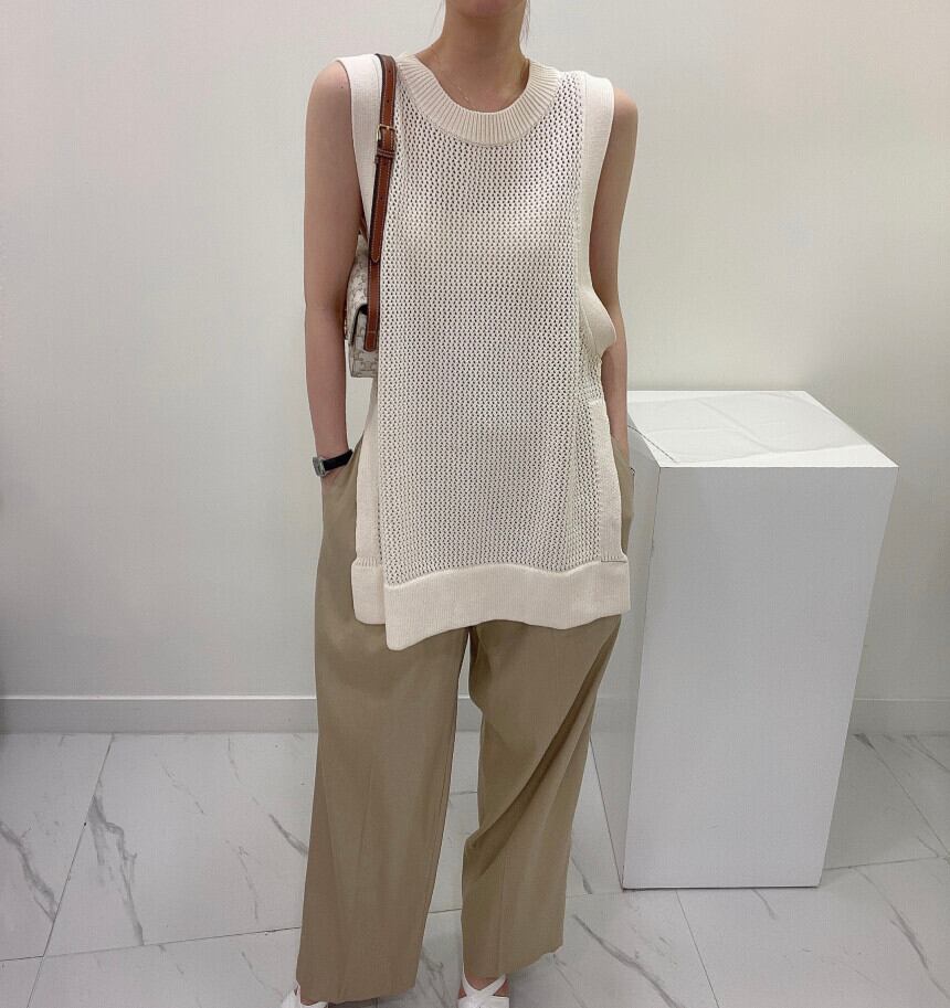 送料無料 2023 夏中空アウトニットベスト女性服ピンク O ネックルーズノースリーブ Y2K トップス黒 Tシャツ ブラック サマー 夏物 Oネック AE1212887743037709511