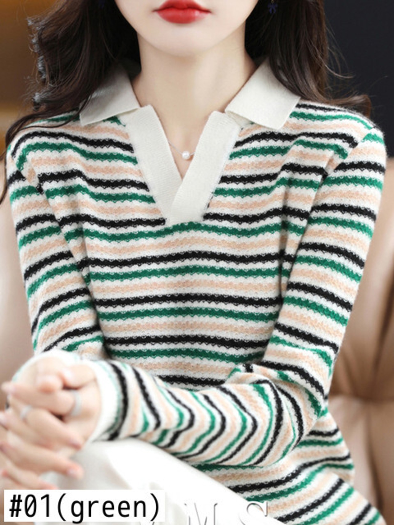 送料無料 ストライプターンダウン襟プルオーバーセーター女性長袖ニットトップス 2022 秋冬服プル ロング オータム 秋物 ウィンター 冬物 AE1212887752210346263 | 女性の為の通販サイト-fashion navi