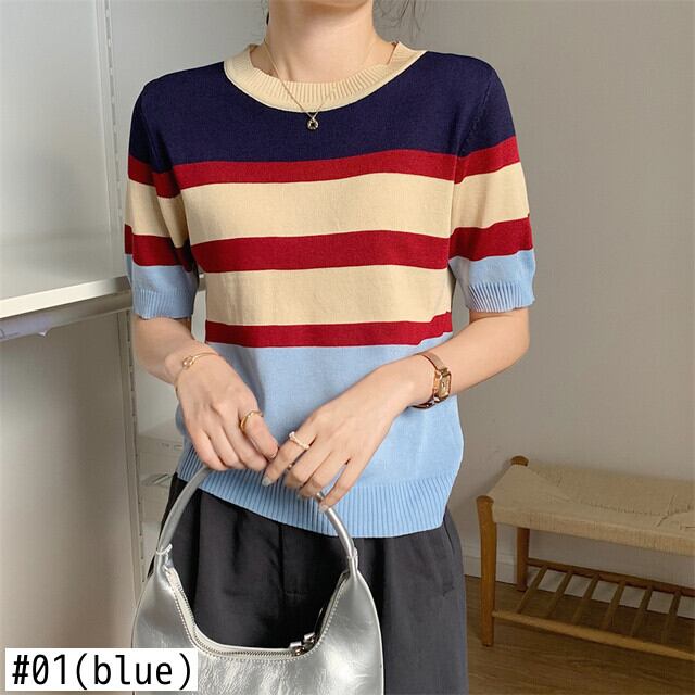 送料無料 ニットトップジャンパー女性 2022 夏ルーズプルオーバーカラーブロックストライプ半袖 O ネックニットセーター ショート ハーフスリーブ サマー 夏物 Oネック AE1212887729948350085