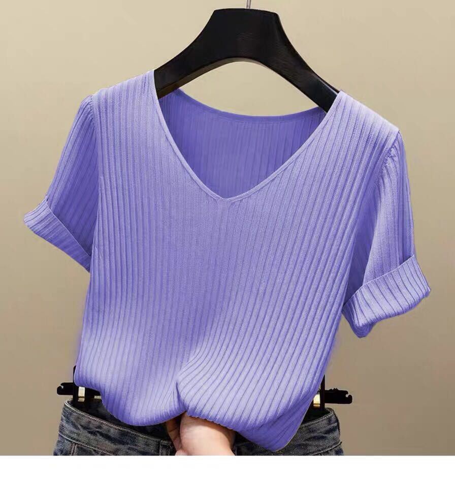 送料無料 Tシャツ女性 2022 ニット半袖 Tシャツ夏の V ネック女性白トップス Tシャツ Camisetas デ ショート ホワイト ハーフスリーブ サマー 夏物 Vネック AE1212887722859289789