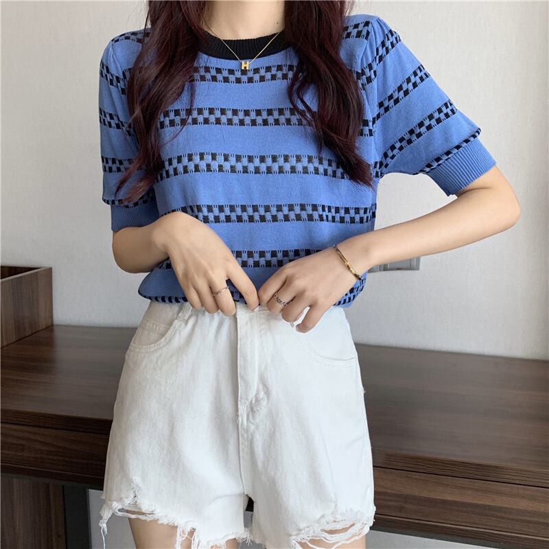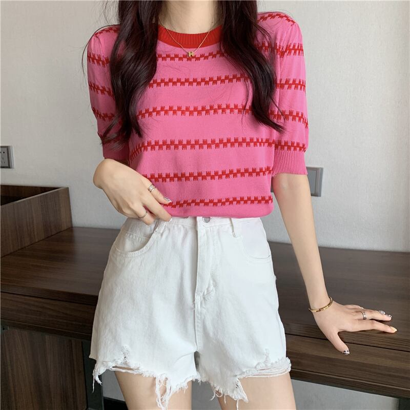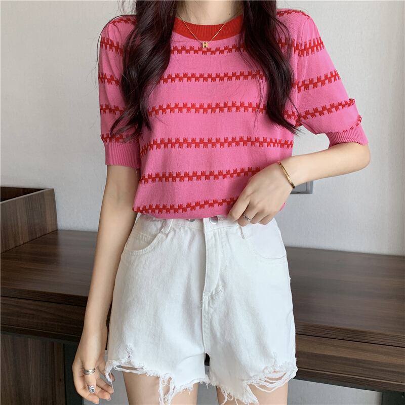送料無料 LJSXLS ストライプ Tシャツ女性ニット O ネック半袖 Tシャツトップス夏の女性の服 Camisetas デ ショート ハーフスリーブ サマー 夏物 Oネック AE1212887760025160810