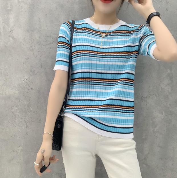 送料無料 2022 春夏薄いセーター女性ストライププルオーバーセーター服半袖ニットトップスプル ショート ハーフスリーブ スプリング 春物 サマー 夏物 AE1212887727921182407