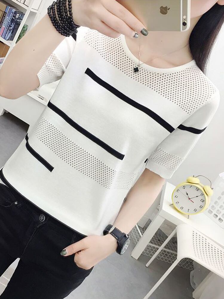 送料無料 Tシャツ 2022 夏ニット Tシャツ女性ストライプ Tシャツルーズ O ネック半袖トップレディース Tシャツ服 ショート ハーフスリーブ サマー 夏物 Oネック AE1212887717402389377 | 女性の為の通販サイト-fashion navi