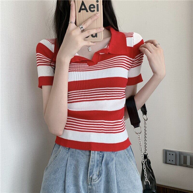 送料無料 Tシャツ 2022 夏ニットクロップトップストライプ Tシャツターンダウン襟女性 Tシャツ弾性服半袖 Tシャツ ショート ハーフスリーブ エラスティック 伸縮 サマー 夏物 AE1212887746526492130