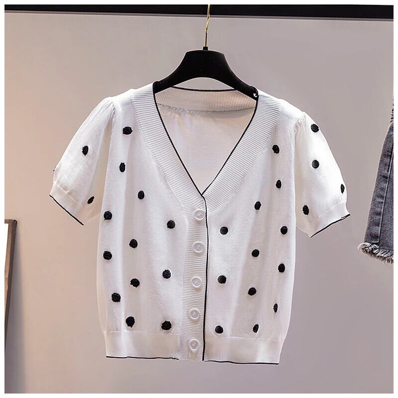 送料無料 ニットカーディガン女性 Tシャツ 2022 V ネックボタンアップトップ半袖 Tシャツ服ポルカドット Tシャツ ショート ハーフスリーブ Vネック AE1212887743341680246 | 女性の為の通販サイト-fashion navi