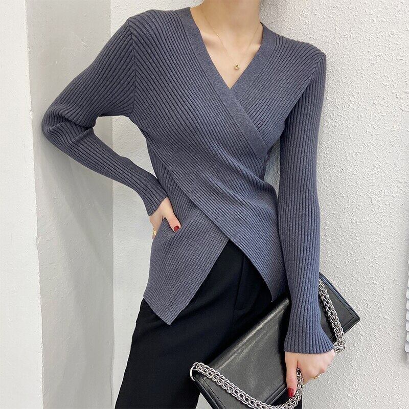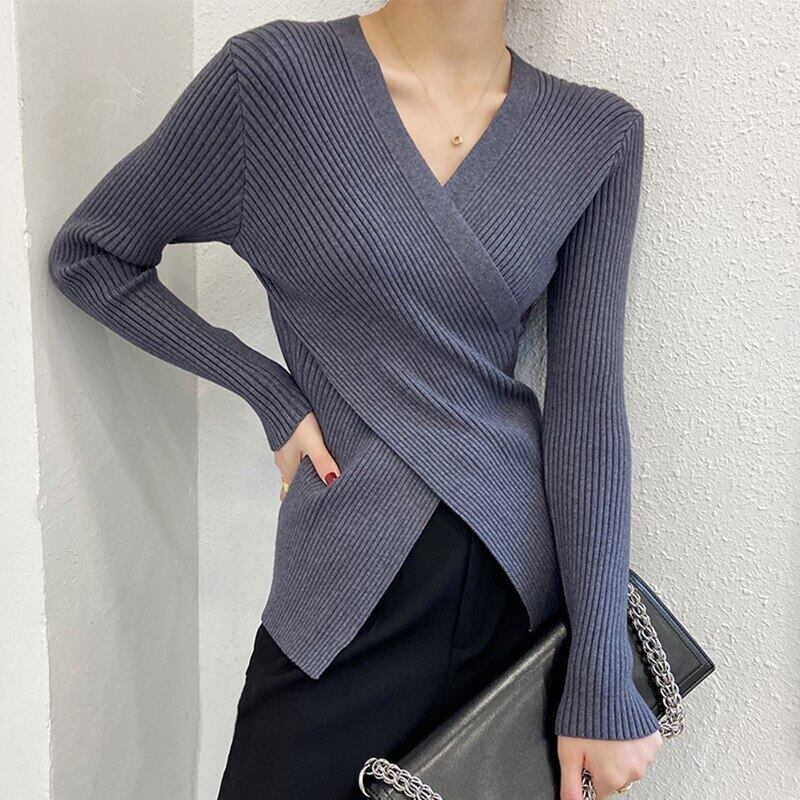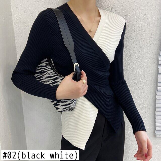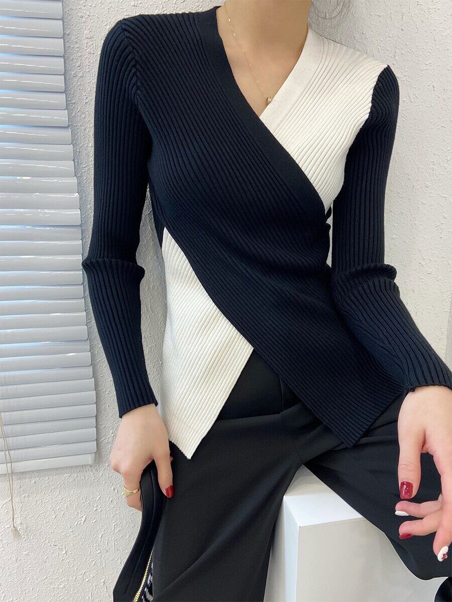 送料無料 2022 秋冬パッチワーク不規則な長袖セーター女性カラーコントラストセクシーな V ネックプルオーバーニットトップス ロング ウィンター 冬物 Vネック AE1212887740394035212