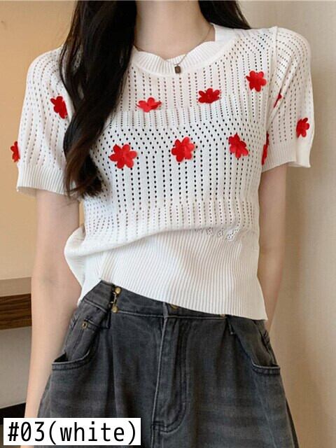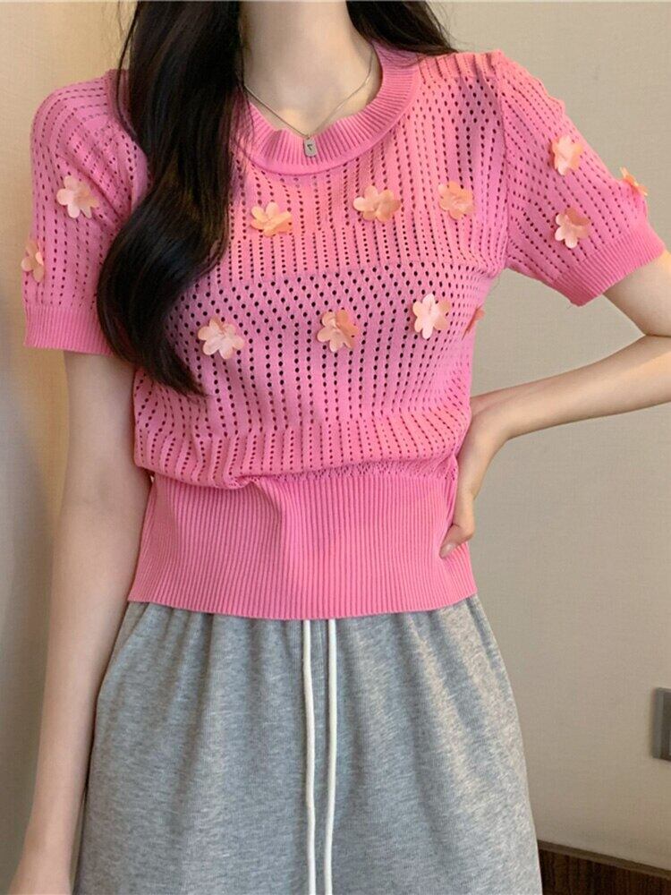 送料無料 中空アウトクロップトップ O ネックアップリケ Tシャツ女性 2022 夏甘いニット Tシャツ弾性服半袖 Tシャツハウト ショート ハーフスリーブ エラスティック 伸縮 大人ガーリー スウィート キュート カジュアル サマー 夏物 Oネック AE1212887799066794479
