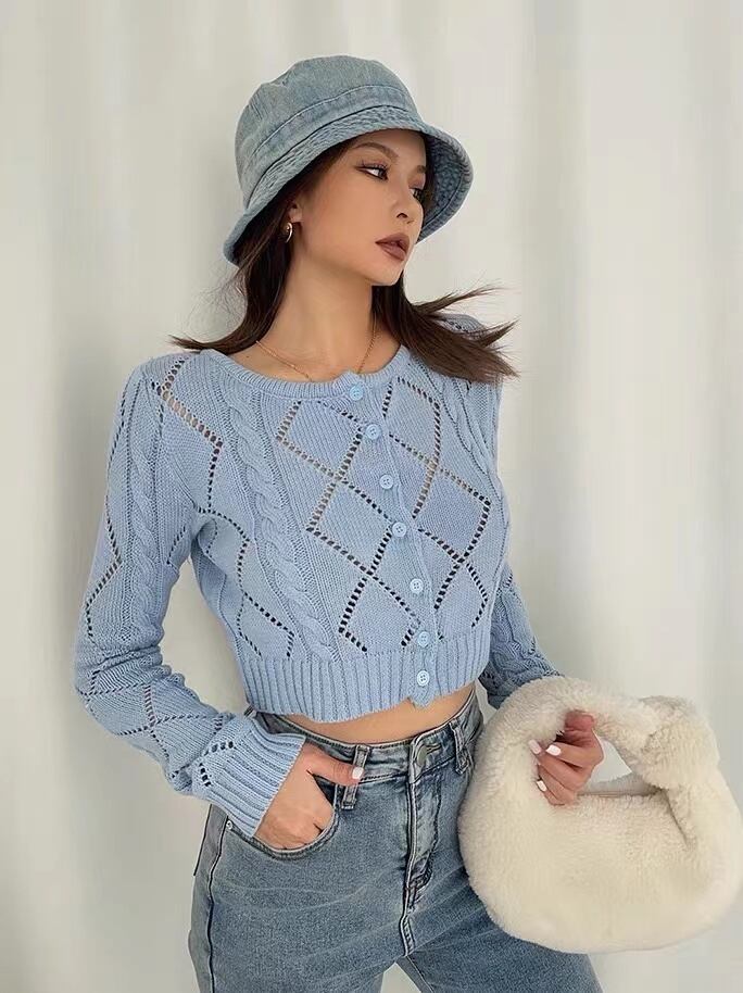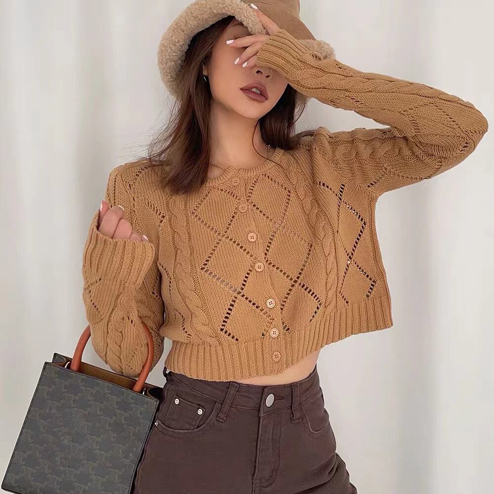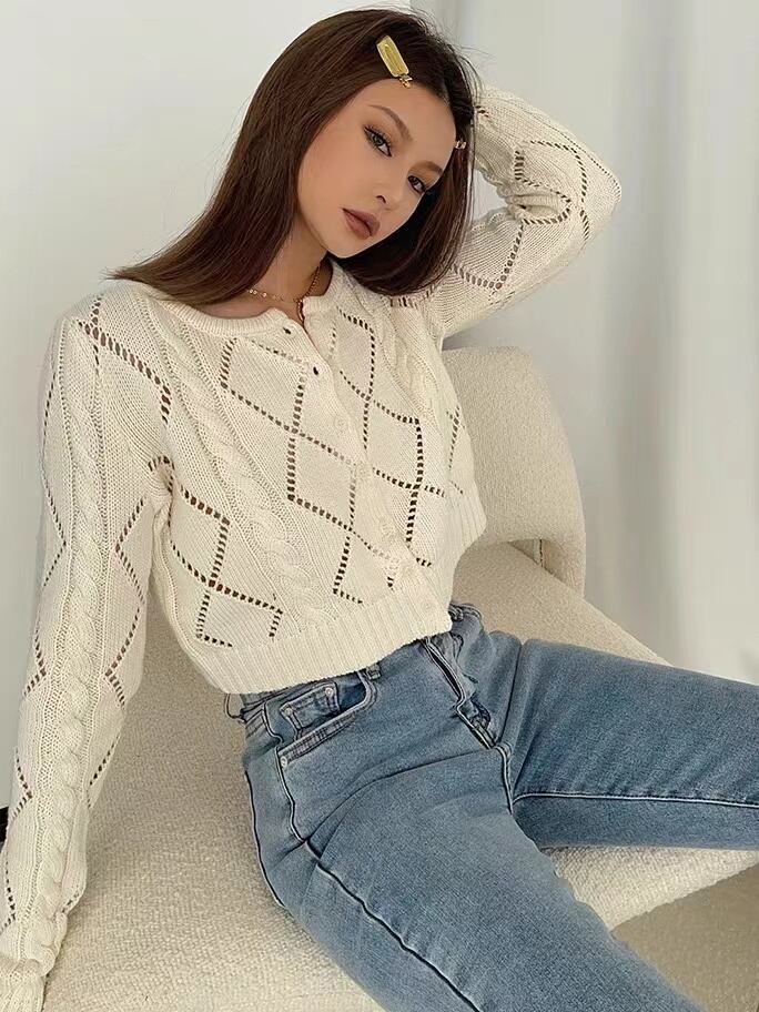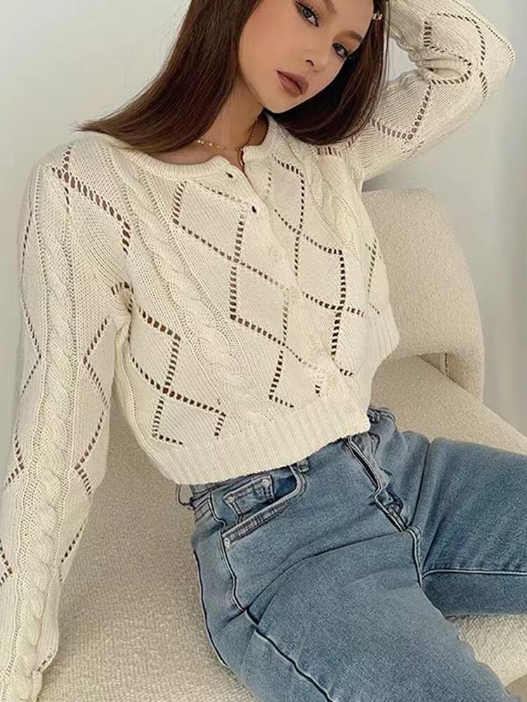 送料無料 ヴィンテージ中空アウト O ネック女性服固体長袖セーターカーディガン女性のセクシーなニットクロップトップス春秋プル ロング スプリング 春物 オータム 秋物 Oネック ソリッドカラー ビンテージ AE1212887745792951076