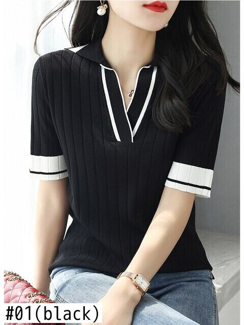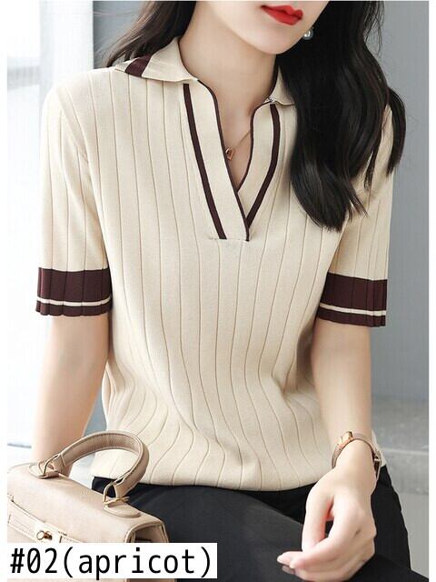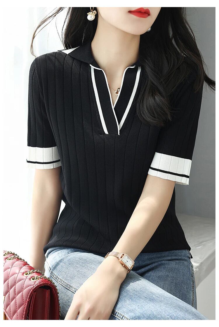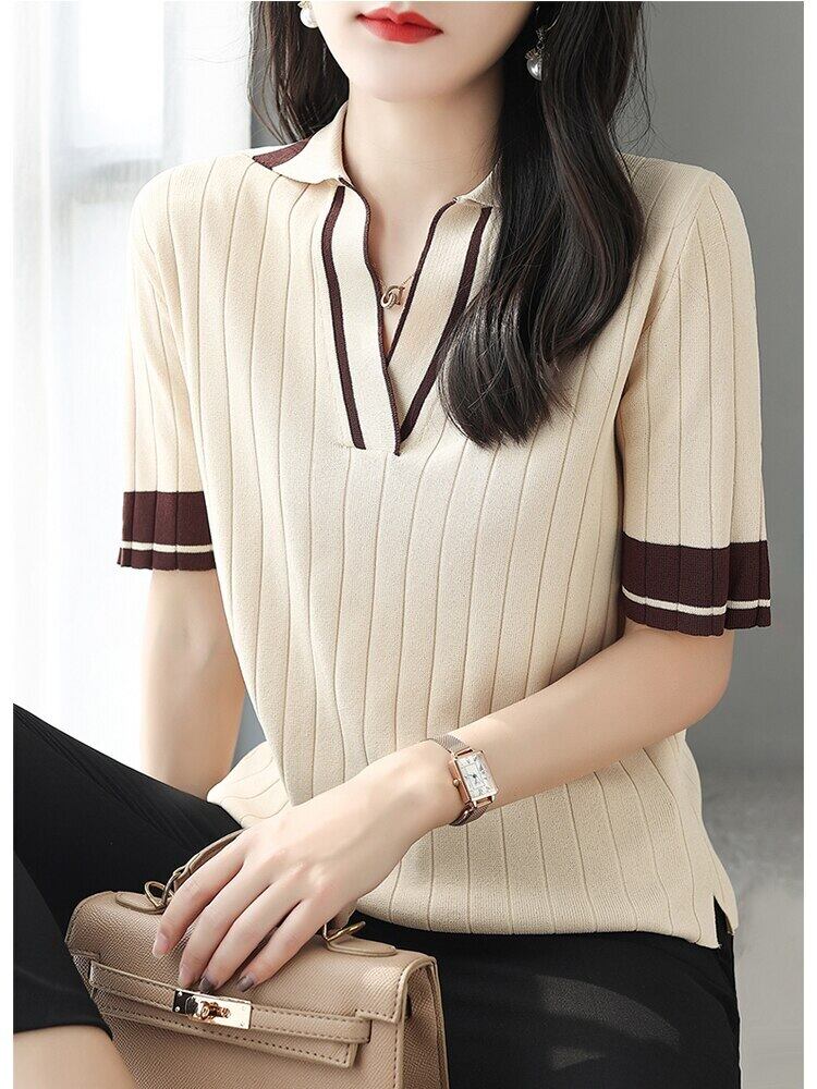 送料無料 ジャージターンダウンカラープルオーバーストライプセーター女性 2022 夏薄型半袖ニットトップス ショート ハーフスリーブ サマー 夏物 AE1212887756645744165