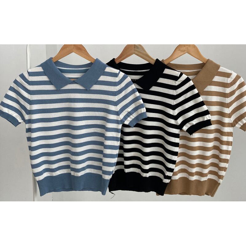 送料無料 セーターズデ夏半袖アイスシルクプルオーバー女性ニットトップスストライプターンダウンカラーセーター ショート ハーフスリーブ サマー 夏物 AE1212887727458763553