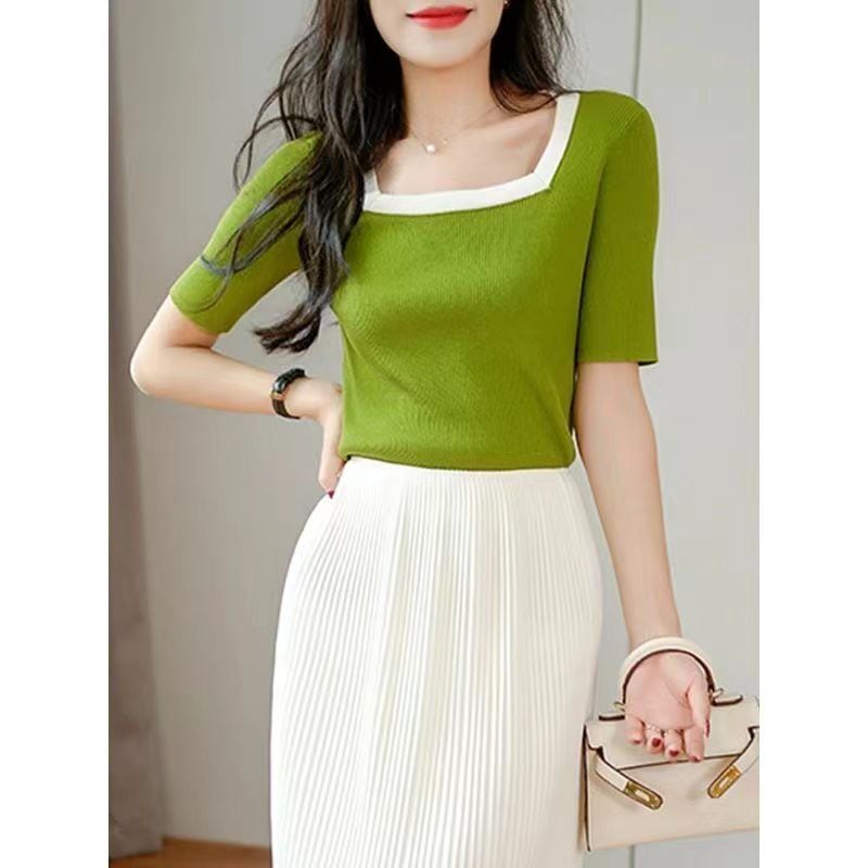 送料無料 2023 夏の Tシャツ女性のセクシーなスクエアカラーニットトップス半袖 Tシャツスリム Tシャツレディース ショート ハーフスリーブ サマー 夏物 スクウェア AE121288772435026429