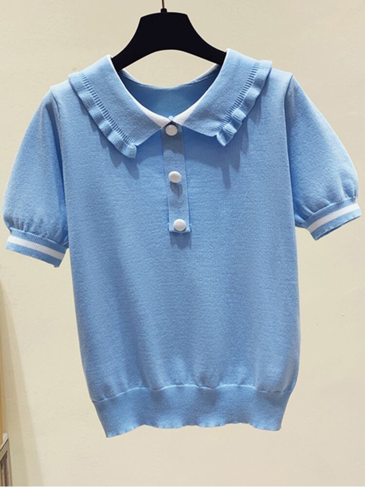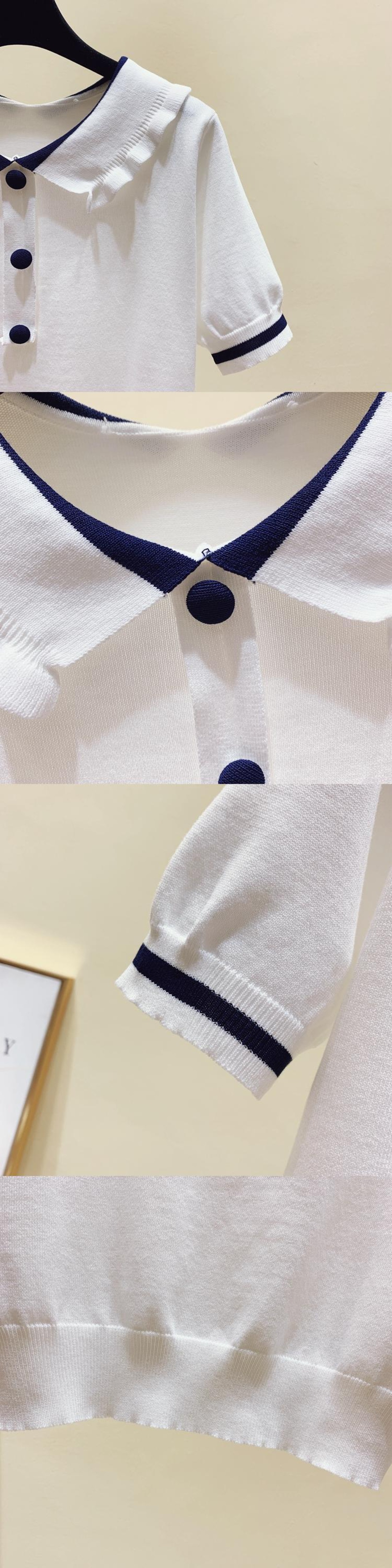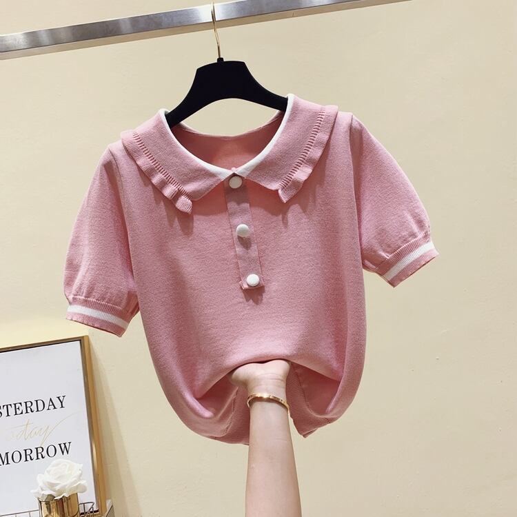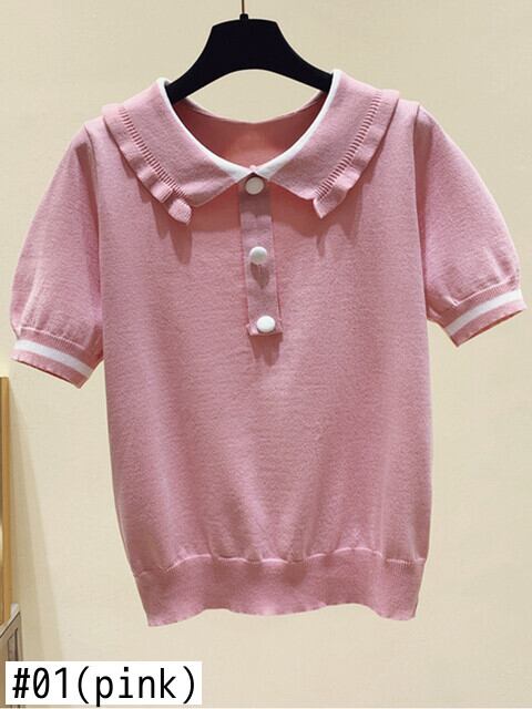 送料無料 ピーターパン襟トップス女性 2022 夏薄いセーターボタンアップトップニットセーター服半袖プルオーバー ショート ハーフスリーブ サマー 夏物 AE1212887749374413085