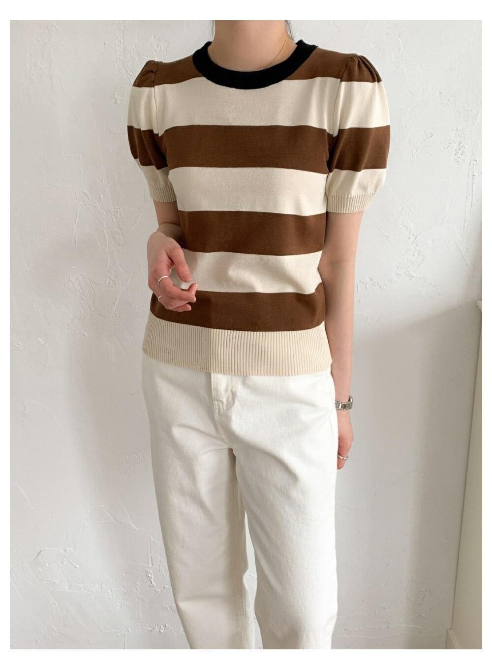 送料無料 2023 夏の女性トップスストライプ O ネックニットセーターアイスシルク半袖プルオーバーセーターデ ショート ハーフスリーブ サマー 夏物 Oネック AE1212887723274806830