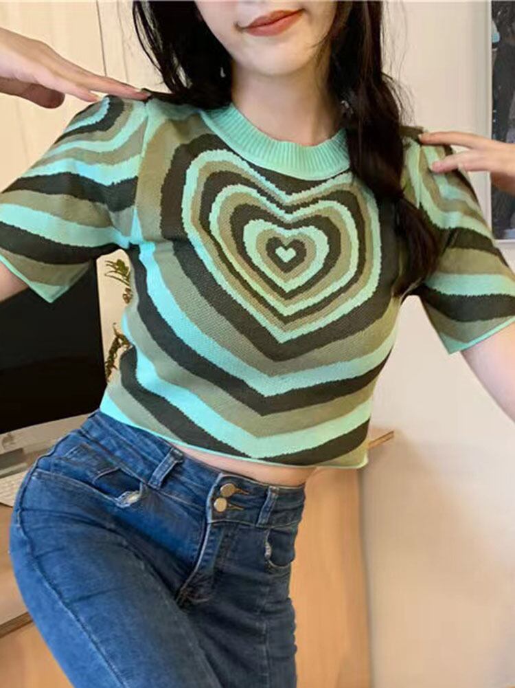送料無料 かわいいハートプリントニット半袖 Tシャツ女性 2022 夏のセクシーなクロップトップス O ネック Tシャツ服 ショート ハーフスリーブ 大人ガーリー スウィート キュート カジュアル サマー 夏物 Oネック AE1212887746960581508