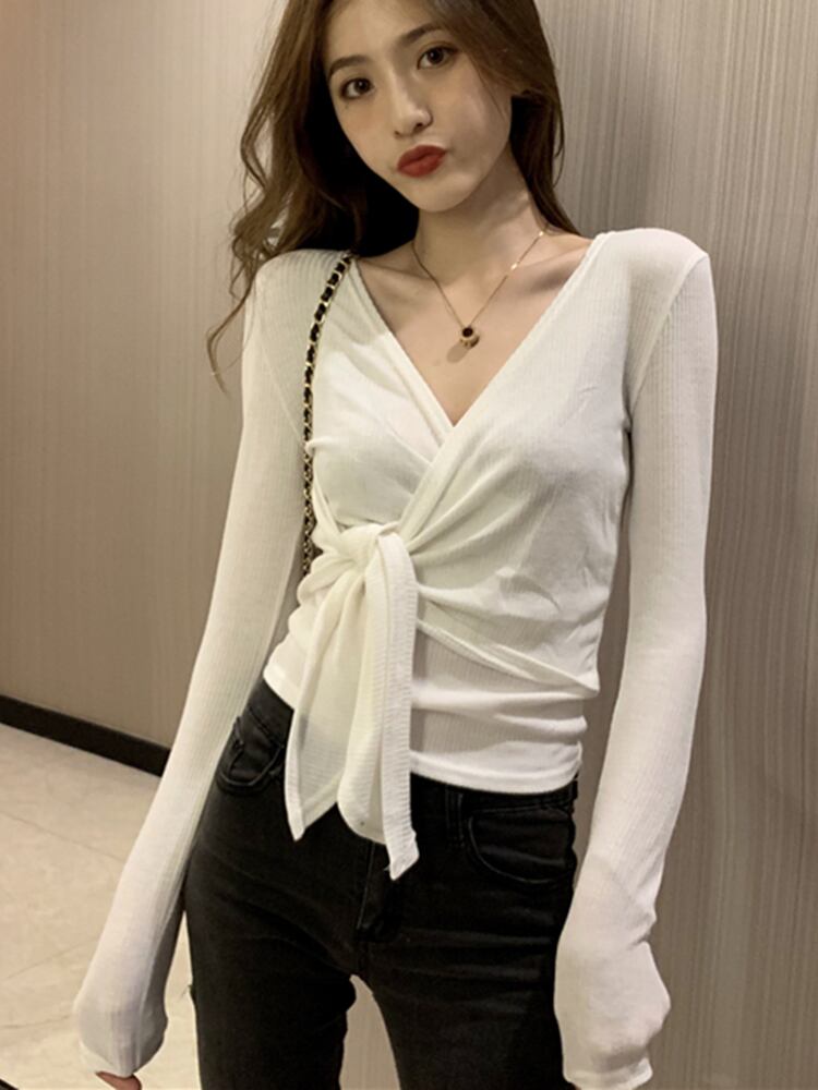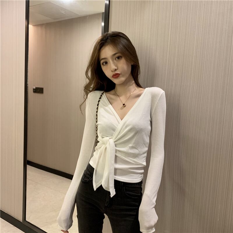 送料無料 セクシーなディープ V ネック Tシャツ女性春秋レディース包帯長袖 Tシャツ Tシャツスリムトップ ロング スプリング 春物 オータム 秋物 Vネック AE1212887747368269966