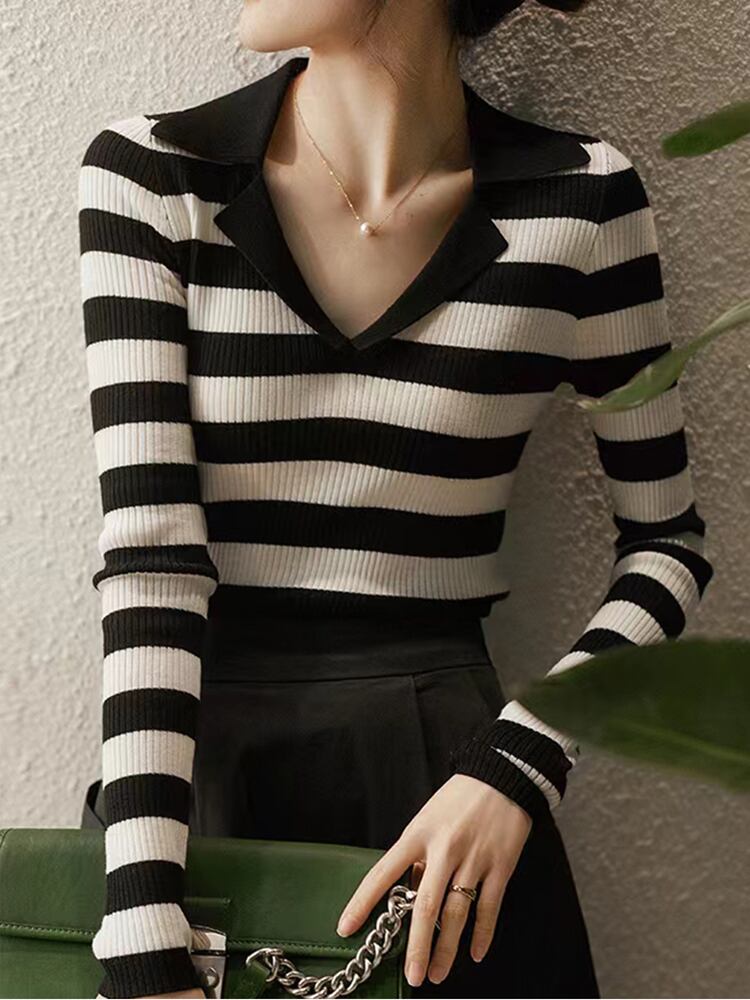 送料無料 服ストライプスリムセーターニットセーター女性 2022 秋冬 V ネックプルオーバー長袖トッププル ロング オータム 秋物 ウィンター 冬物 Vネック AE1212887762383955593