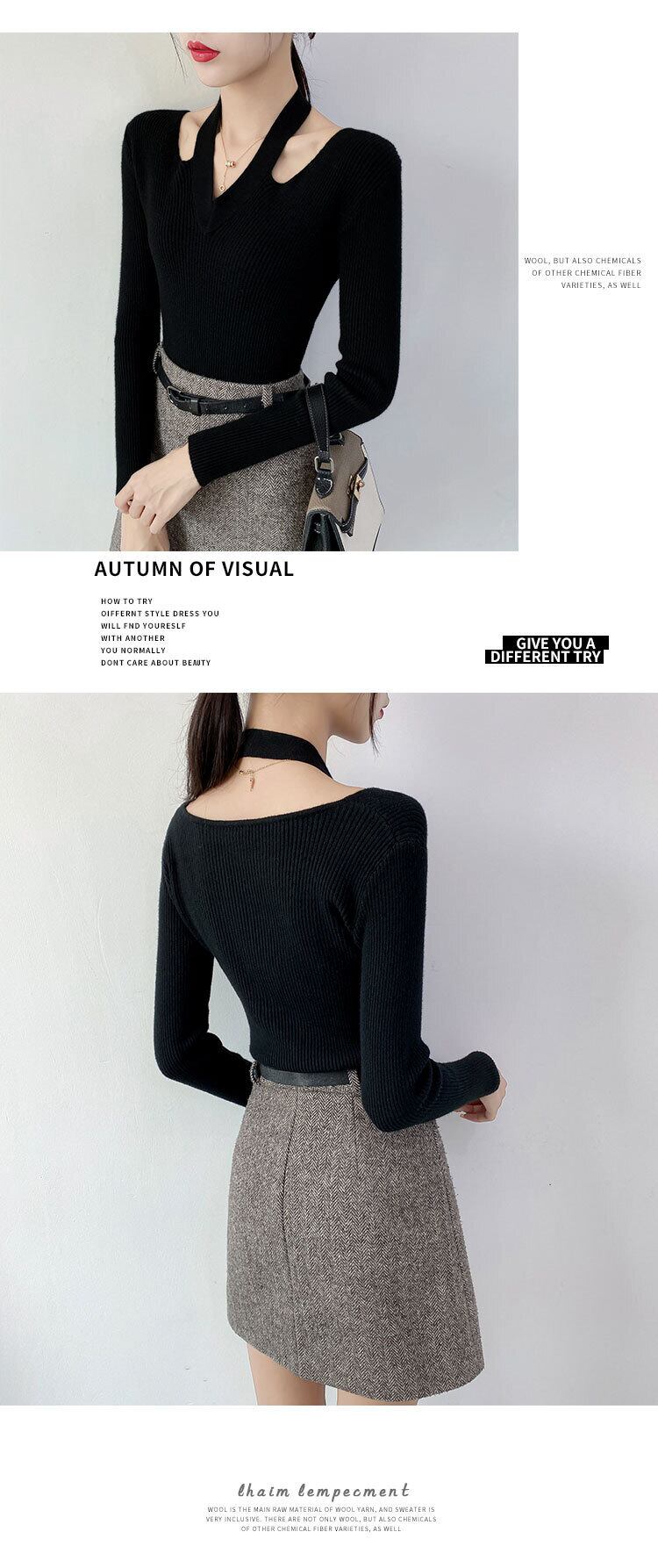 送料無料 黒ニットセーターセクシーな中空アウトセーター女性 2022 秋冬服ホルター V ネック長袖トップスリムプルオーバー女性 ロング ブラック オータム 秋物 ウィンター 冬物 Vネック AE1212887716144749439