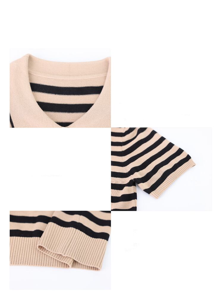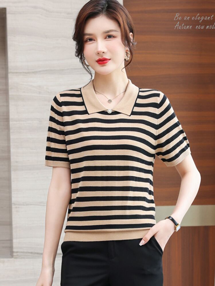 送料無料 夏服女性ストライプニット Tシャツターンダウン襟 Tシャツ半袖トップス 2022 Camisetas ショート ハーフスリーブ サマー 夏物 AE1212887738126265223