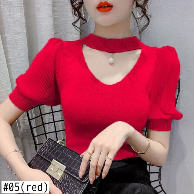 送料無料 パッチワーク V ネックニット Tシャツ女性パフ半袖トップセクシーなスリムソリッド Tシャツ夏の女性の服 2022 ショート ハーフスリーブ サマー 夏物 Vネック ソリッドカラー AE1212887755683673405