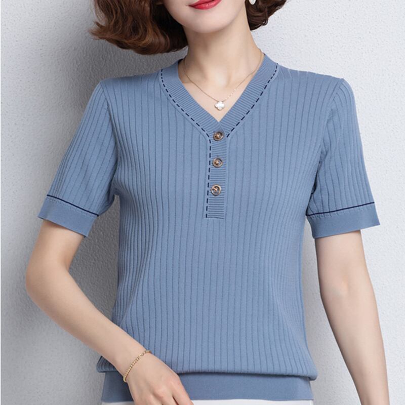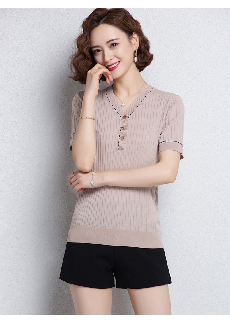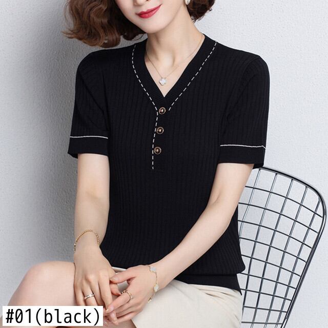 送料無料 2023 夏の Tシャツ V ネック半袖 Tシャツ女性ニットトップアイスシルク黒 Tシャツ服 ショート ブラック ハーフスリーブ サマー 夏物 Vネック AE1212887787187603548