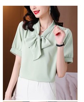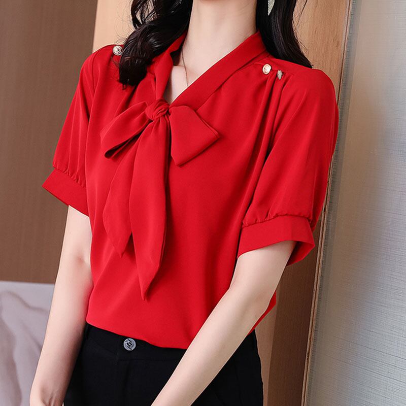 送料無料 弓ブラウス 2022 夏ブラウス女性ボタン半袖トップシャツホワイトデ ショート ハーフスリーブ サマー 夏物 AE1212887785314867908