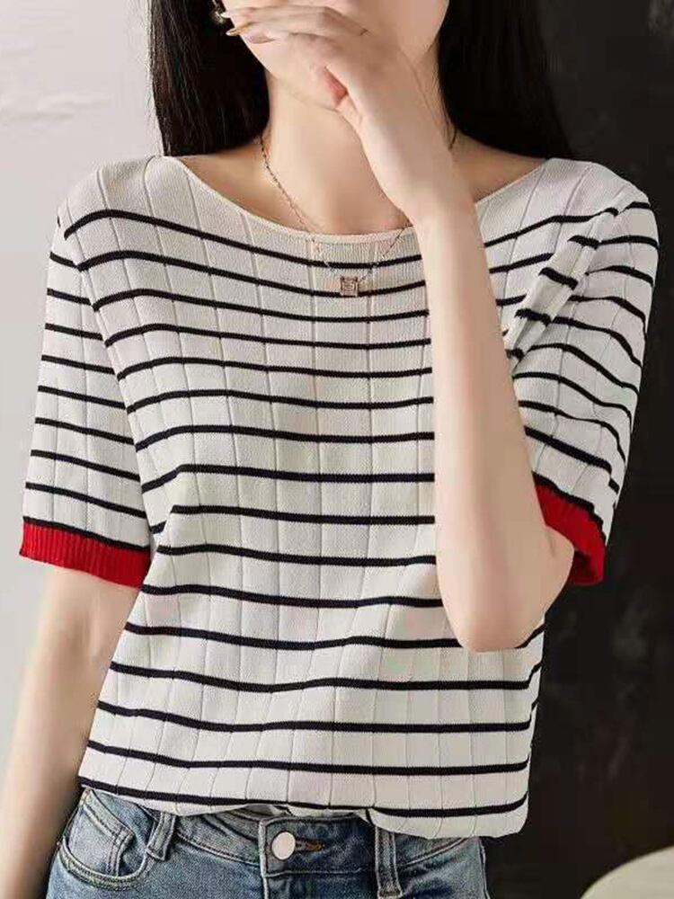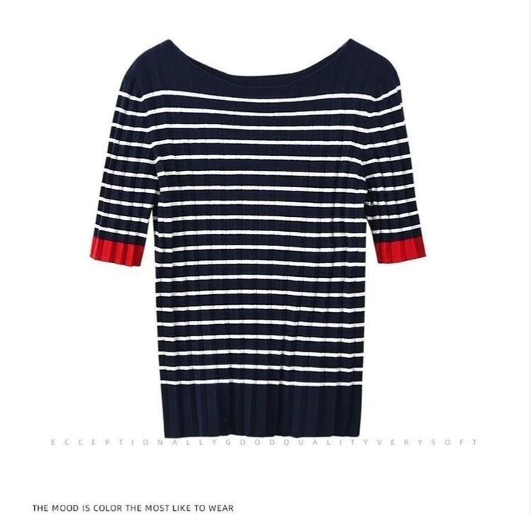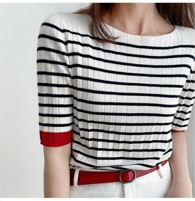 送料無料 2022 夏の薄いセーター女性ストライプセータープルオーバーコルトンルーズ服弾性半袖ニットトップス ショート ハーフスリーブ エラスティック 伸縮 サマー 夏物 AE1212887794519674969