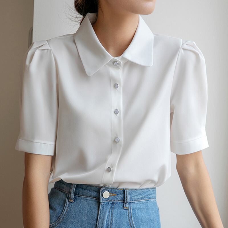送料無料 2023 夏白シャツ女性半袖ルーズオフィストップスシフォンブラウス ショート ホワイト ハーフスリーブ サマー 夏物 会社 学校 通勤や通学にも AE1212887772321602814