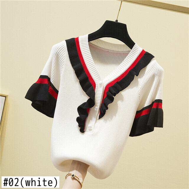 送料無料 スタイルフリル V ネックアイスシルクセーター女性半袖プルオーバー 2022 春夏薄型スリムニットトップス ショート ハーフスリーブ スプリング 春物 サマー 夏物 Vネック AE1212887710398265458