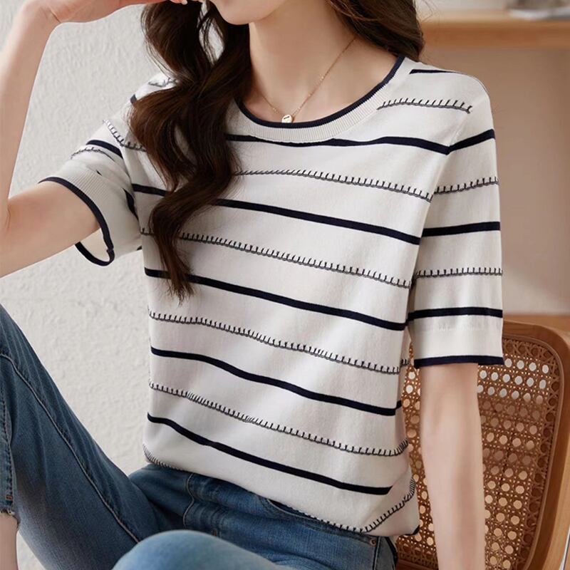 送料無料 2023 夏の Tシャツ女性 O ネック半袖 Tシャツルーズストライププルオーバーニットトップス薄い Tシャツ ショート ハーフスリーブ サマー 夏物 Oネック AE1212887748853486440 | 女性の為の通販サイト-fashion navi