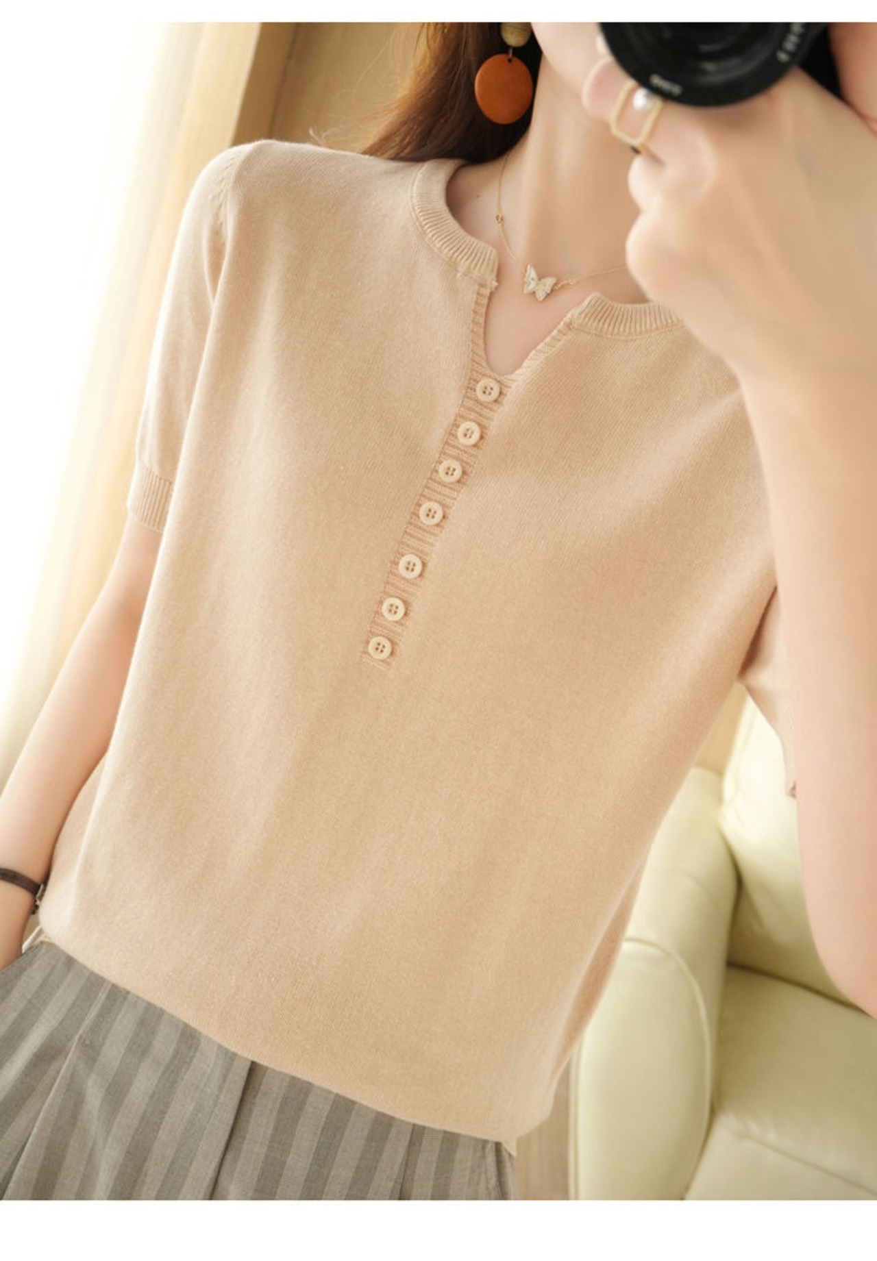 送料無料 半袖セーターの女性の夏薄いニットトップボタンアップトップスルーズ服セーター 2022 ショート ハーフスリーブ サマー 夏物 AE1212887787818378118