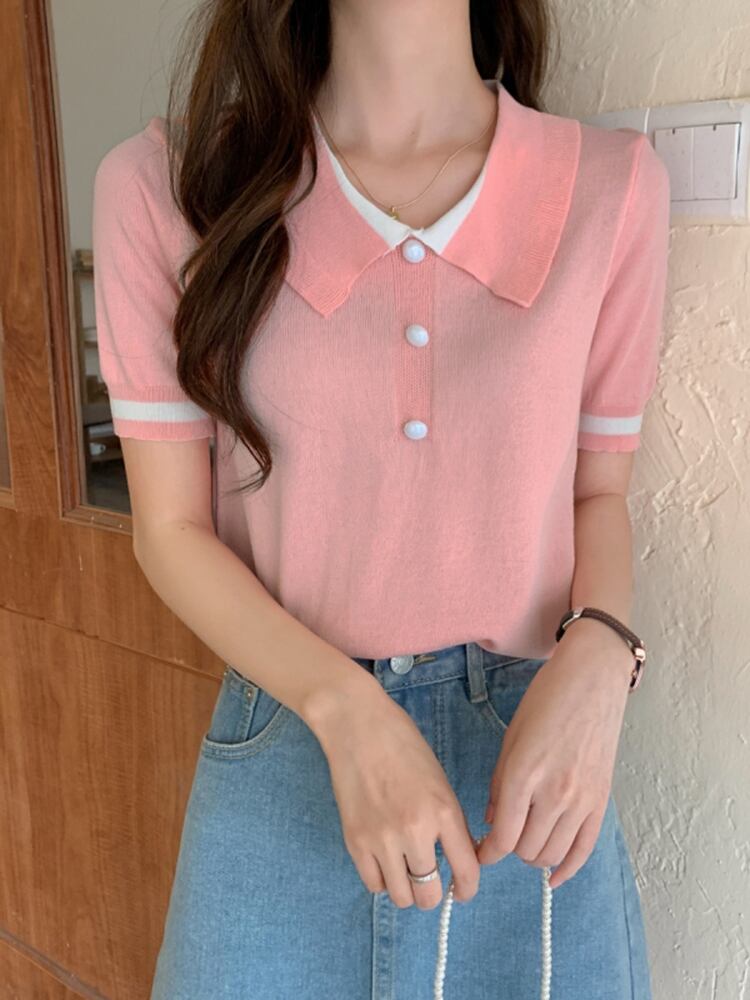 送料無料 ニットセーター女性ターンダウン襟ボタンアップトップ 2022 夏薄いニットプルオーバー服半袖セーター ショート ハーフスリーブ サマー 夏物 AE1212887723303320909
