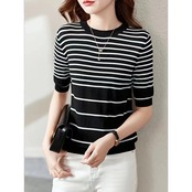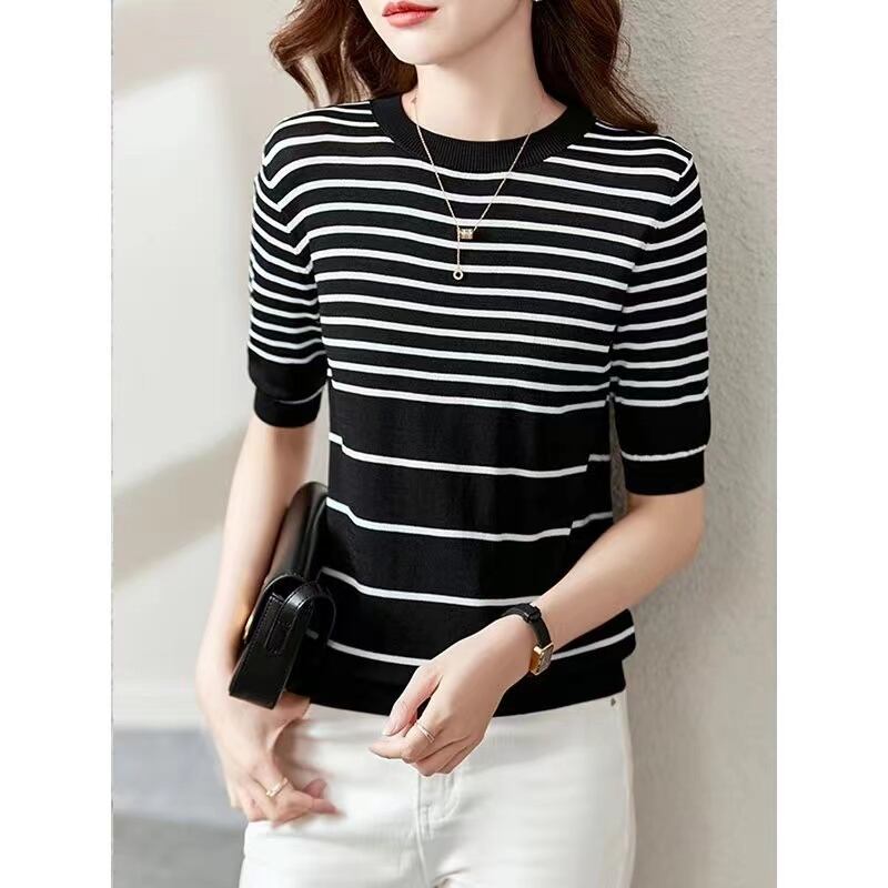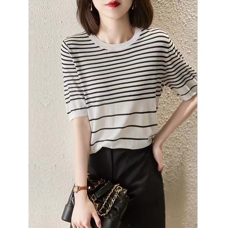 送料無料 2023 夏ストライプニット Tシャツ女性トップス薄型ルーズ Tシャツ半袖 Tシャツ Ropa デ ショート ハーフスリーブ サマー 夏物 AE1212887723947482432