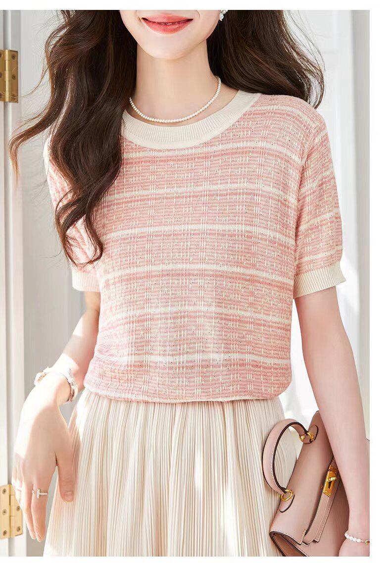 送料無料 O ネック Tシャツ女性ストライプアイスシルクニット半袖トップス 2023 薄い Tシャツ夏服 Tシャツ ショート ハーフスリーブ サマー 夏物 AE1212887741880633413