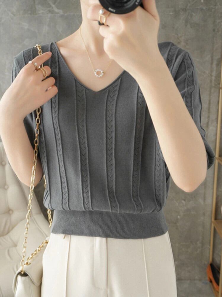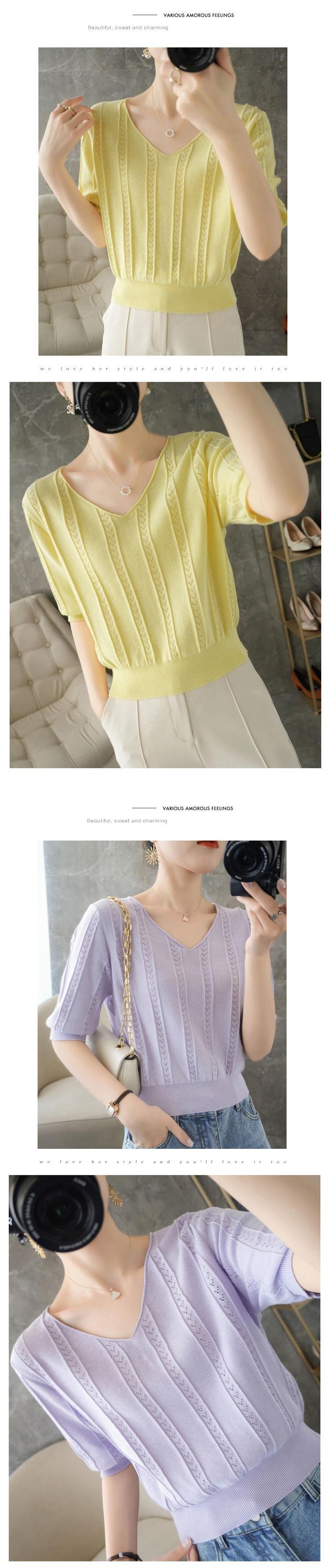 送料無料 ニット中空アウトクロップトップ Tシャツ V ネック半袖 Tシャツストライプ Tシャツ女性の夏の女性の服 2022 トップス ショート ハーフスリーブ サマー 夏物 Vネック AE1212887738600077080