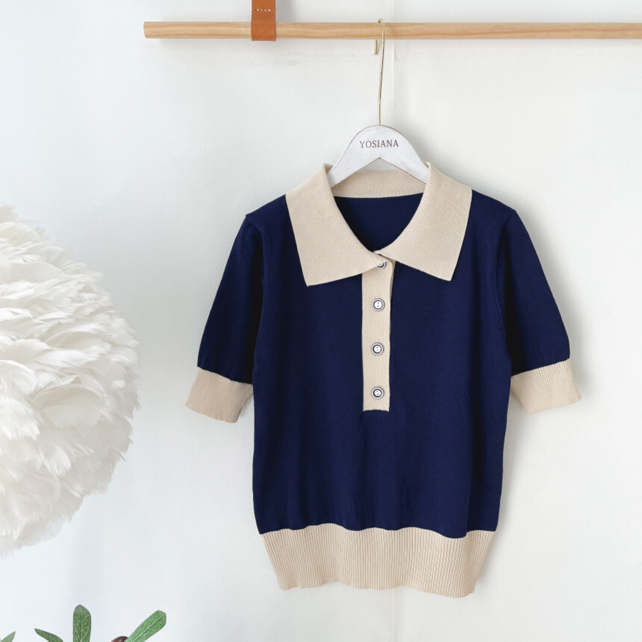送料無料 女性トップスストライプボタンターンダウンカラーニットセーター半袖アイスシルクプルオーバーセーターデ ショート ハーフスリーブ AE1212887737197062334 | 女性の為の通販サイト-fashion navi
