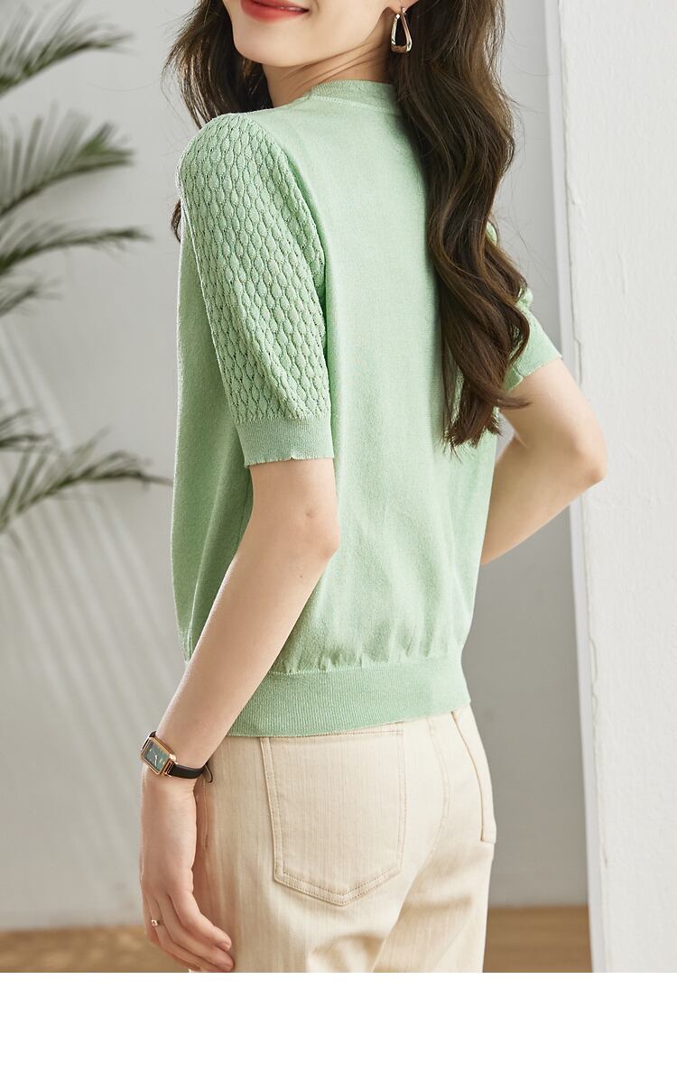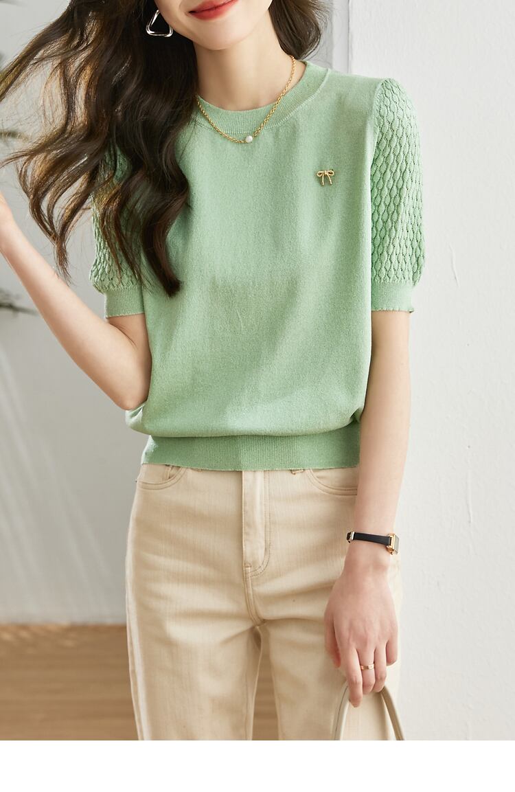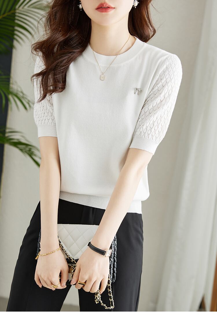 送料無料 ホワイトルーズ薄型ニット女性 Tシャツ 2023 夏 Tシャツ半袖 Tシャツ O ネック弾性トップ服 ショート ハーフスリーブ エラスティック 伸縮 サマー 夏物 Oネック AE1212887764089819410