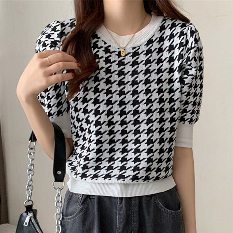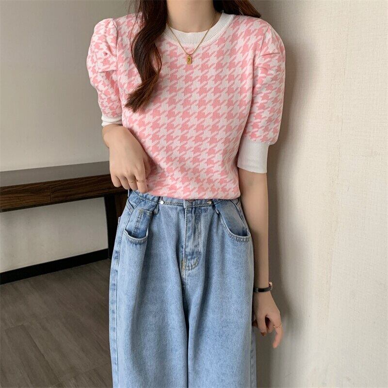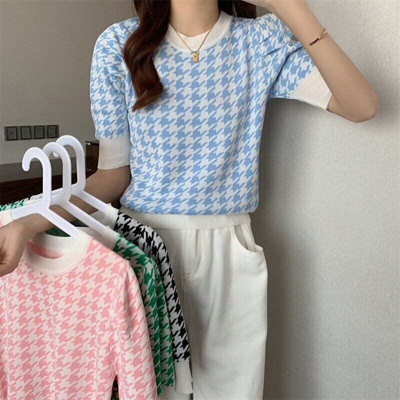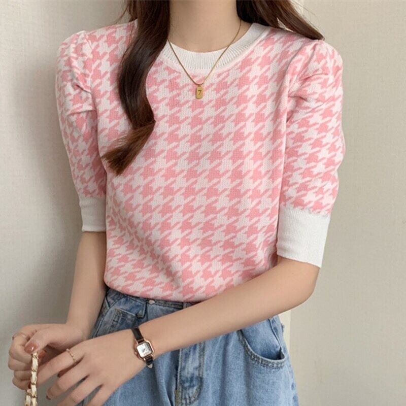 送料無料 2022 夏パフ Sleev クロップトップ女性 Tシャツチェック柄レディーストップスニット女性服半袖 Tシャツ Camisetas デ ショート ハーフスリーブ サマー 夏物 AE1212887724851356549