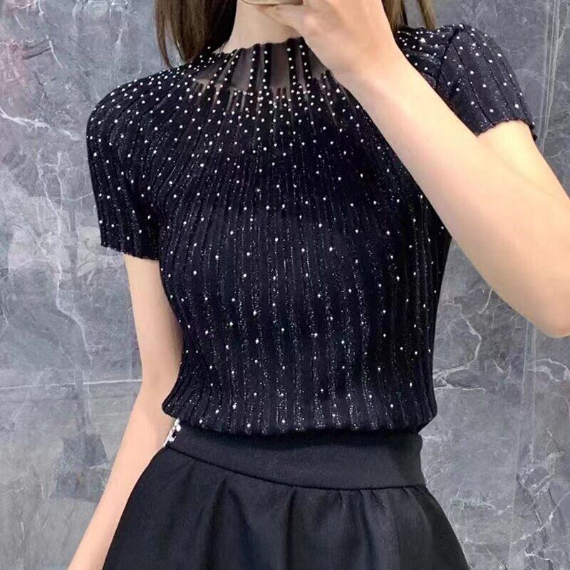 送料無料 ピンク、白のスリムニットトップス女性ダイヤモンド半袖 Tシャツ夏 O ネック Tシャツパッチワーク Tシャツ ショート ホワイト ハーフスリーブ サマー 夏物 Oネック AE121288777090956123