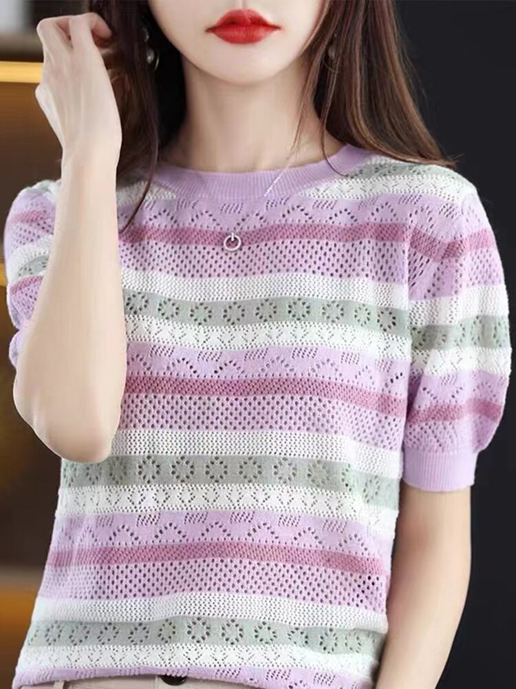 送料無料 薄い中空アウトニットトップスストライプ半袖セーター女性 O ネックプルオーバー夏服 ショート ハーフスリーブ サマー 夏物 Oネック AE1212887756087886779 | 女性の為の通販サイト-fashion navi