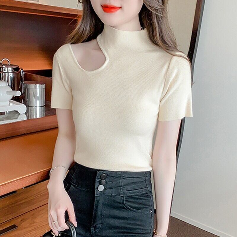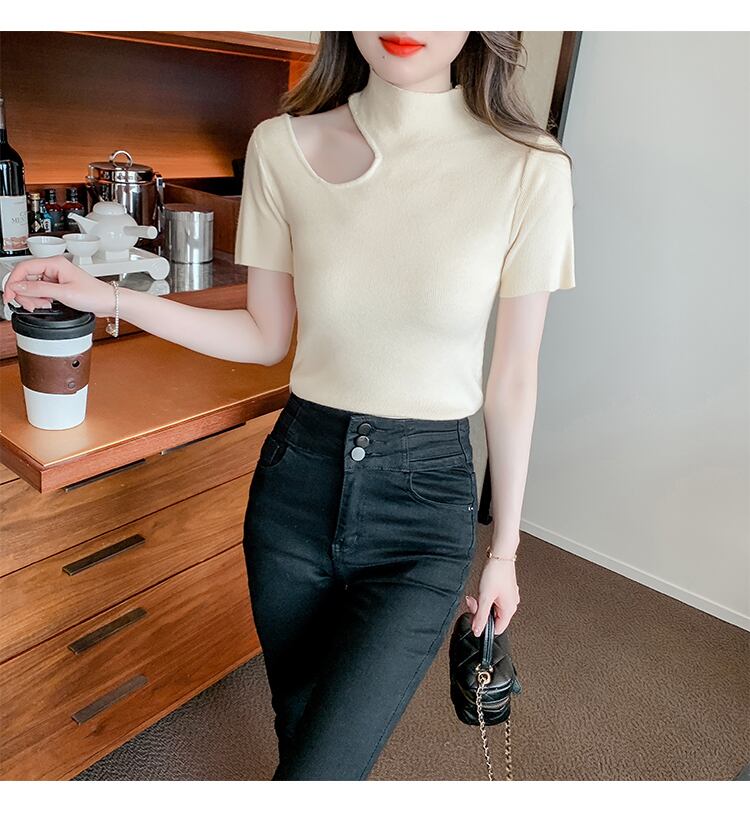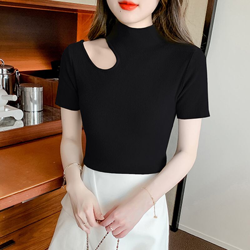 送料無料 セクシーな中空アウトスリムニットトップス女性半袖 Tシャツタートルネック Tシャツ Tシャツ夏のレディース ショート ハーフスリーブ サマー 夏物 AE1212887746152076185